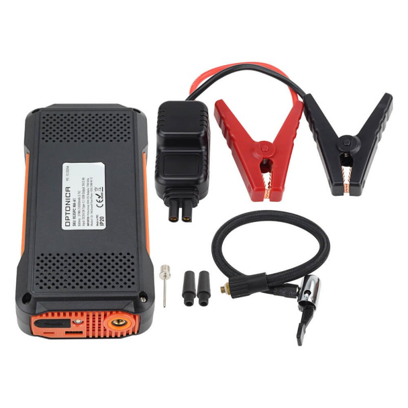 • A csomag tartalma: Akkumulátoros kompresszor, bikázó kábel csipeszekkel, levegőtömlő, USB-C kábel, 3 féle szelepátalakító, használati útmutató.