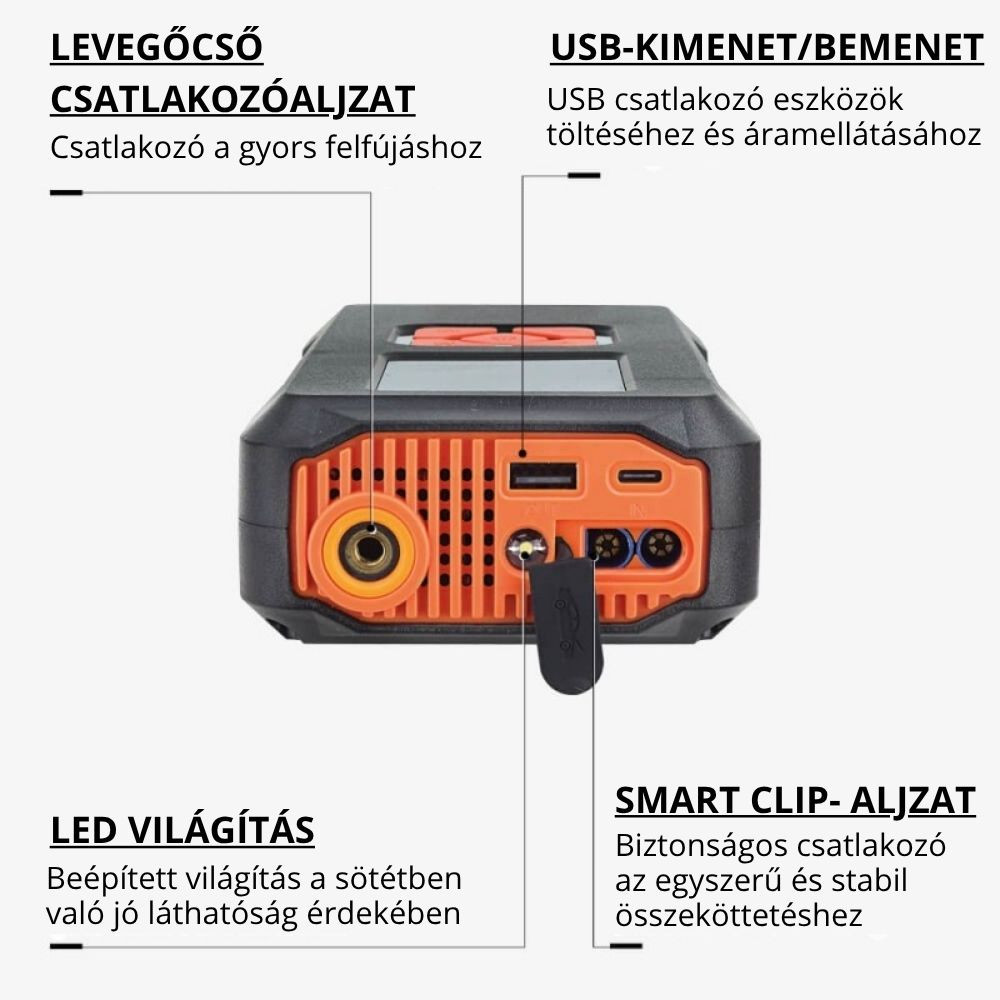 • Digitális Kompresszor: Felejtsd el a benzinkúti sorban állást. A beépített kompresszorral hajszálpontosan beállíthatod a guminyomást 2 és 10,3 Bar között. A digitális kijelzőn látod az aktuális értéket, a gép pedig magától leáll, ha elérte a célnyomást. Nem csak autóhoz, de bringához, matrachoz és labdához is tökéletes a mellékelt adapterekkel.