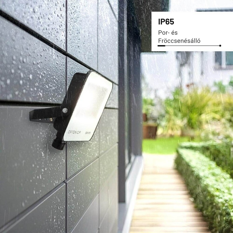 • Masszív, Időtálló Kivitel (IP65): Ez a reflektor nem fél az időjárástól. Az IP65 védelem teljes védelmet nyújt a por és az erős vízsugár ellen is, így garantált a hosszú, megbízható működés.