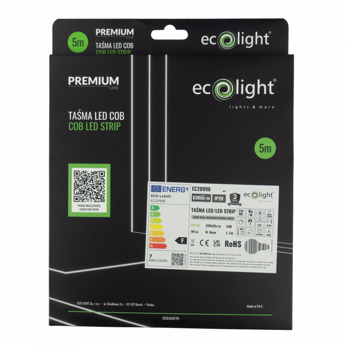 Prémium COB LED Szalag 24V, 7W/m, 630lm/m 320LED/m– Pontmentes, CRI90, Természetes Fehér (4000K)