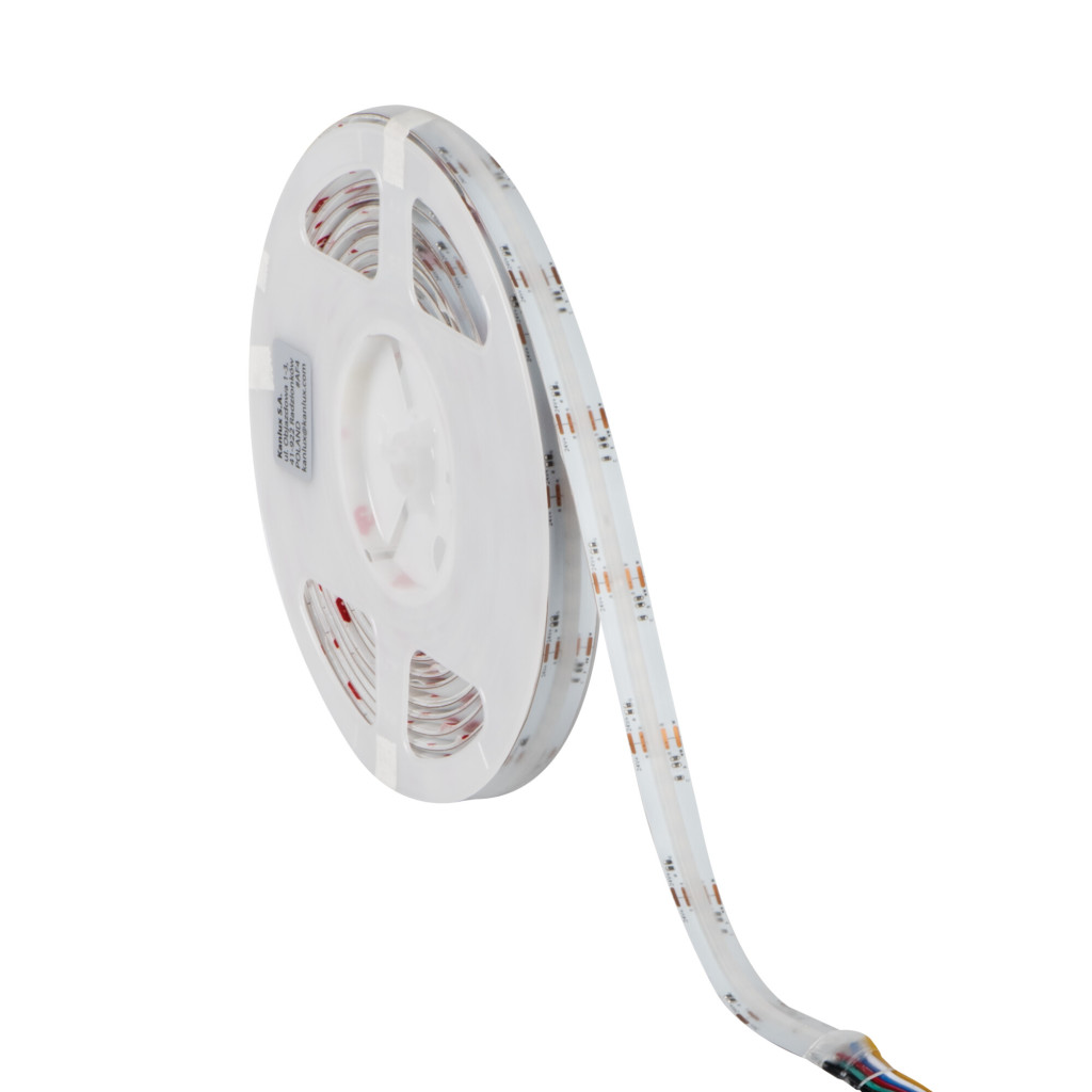Kanlux LCOB-21W-M24IP65-RGBCCT LED szalag 21W/m teljesítménnyel, RGB és CCT (2700K-6500K) funkcióval, COB technológiával, 24V-os működéssel, IP65 vízálló védettséggel.