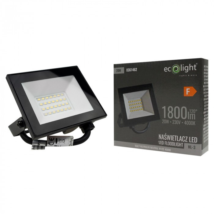 Fekete Ecolight 20W-os kültéri LED reflektor szenzor nélküli, kapcsolós kivitelben, természetes fehér fénnyel