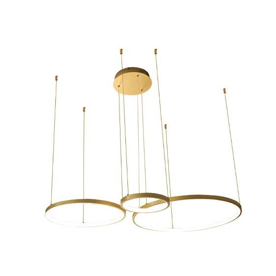 Az LVT Hodo LED csillár három különböző méretű (20-40-60cm) arany gyűrűből álló, impozáns fényforrás, amely 77W teljesítménnyel és integrált LED technológiával biztosít kiváló megvilágítást. Fali kapcsolóval szabályozható a lámpatest színhőmérséklete (3000K-6500K), így mindig az alkalomhoz illő hangulatot teremtheted meg. Ideális modern nappalikba, étkezőkbe, irodákba.