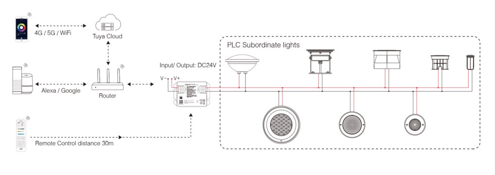 Szeretnél színes fényeket a kertbe, de csak 2 eres kábeled van? A MiBoxer PLC Master a megoldás! Ez az eszköz a DC 24V törpfeszültségen küldi a vezérlő jelet. Nem kell 4-5 eres vezetéket behúznod: ugyanazon a 2 éren megy az áram és a vezérlés is. Ideális kerti lámpákhoz, vagy medencecilágításhoz hosszú távolságokra. Figyelem: Működéséhez DC Tápegység szükséges!