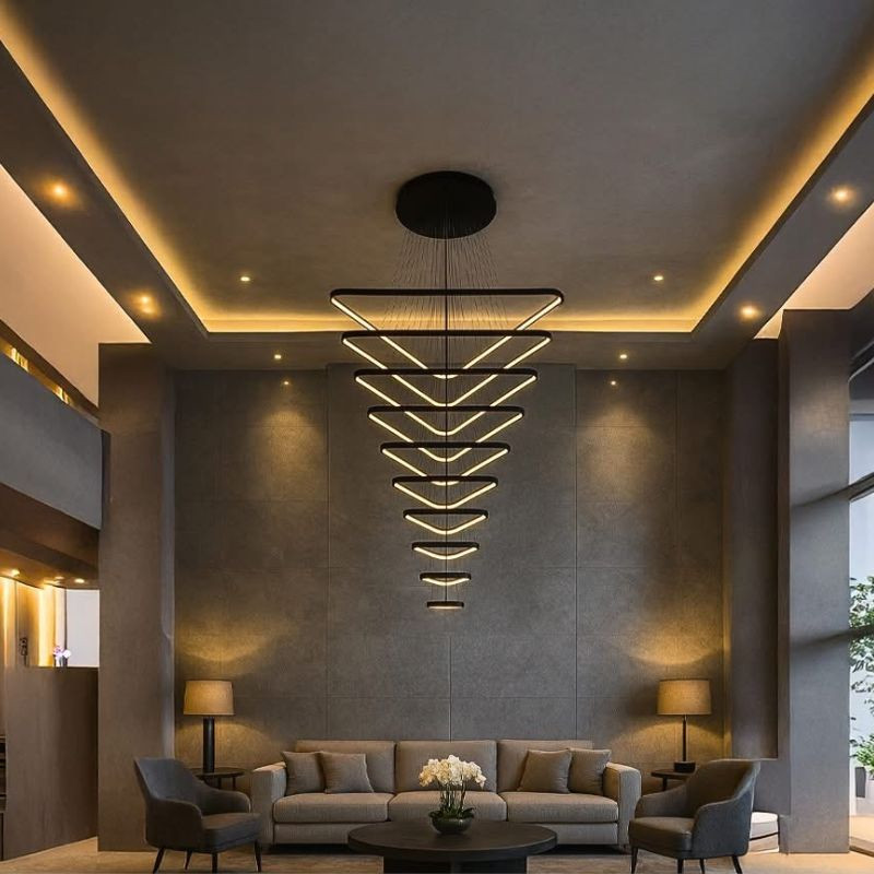 Hozz létre felejthetetlen vizuális élményt és tökéletes megvilágítást a Nedes Triangle óriás LED függőlámpával! Ez a monumentális fényforrás nem csupán világít, hanem központi dizájnelemként határozza meg a tér hangulatát és stílusát. 7db különböző élhosszúságú, elegáns fekete alumínium profilból formált háromszög alakzatával modern és futurisztikus megjelenést kölcsönöz, miközben a legmodernebb LED technológiával biztosítja a kivételes funkcionalitást.