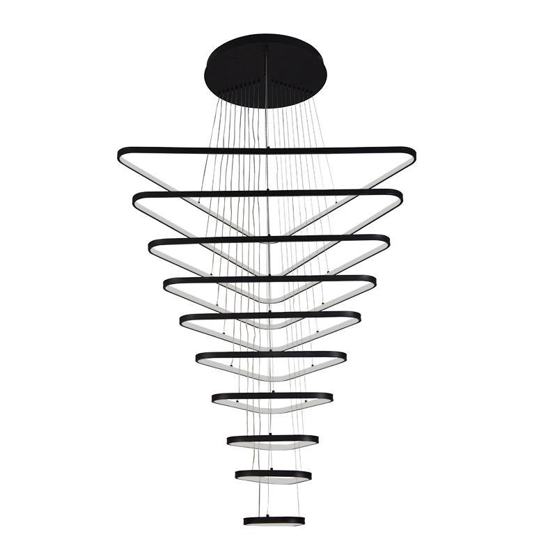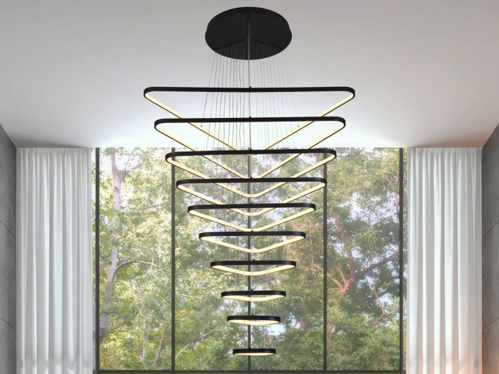 A Triangle óriás LED függőlámpa 10 db fekete alumínium profilból formált háromszög alakkból áll, amelyeknek mérete: 150,200,300,400,500,600,700,800,900 és 1000 cm. Összesen 385W teljesítménnyel és integrált LED technológiával biztosít kiváló megvilágítást. Fényereje és színhőmérséklete (3000K-6500K) távirányítóval és mobil applikációval (Bluetooth) szabályozható, így bármilyen térben egyedi hangulatot teremthetsz. Ideális nagyméretű nappalikba, étkezőkbe, irodákba, vagy látványos közösségi terekbe.