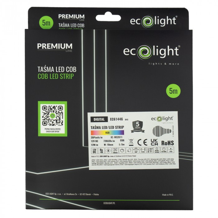 Ez a COB Digitális RGB szalag a két legfejlettebb technológiát egyesíti: a COB a tökéletesen egybefüggő, pontmentes fényvonalért felel, a digitális vezérlés pedig a lélegzetelállító futófény, szivárvány és egyéb animációkért. A legprofibb választás a leglátványosabb eredményért. A digitális LED szalagra 5 év garanciát biztosítunk!
