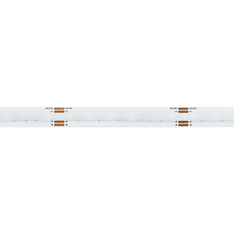 • Teljesen Pontmentes, Homogén Színes Fény: A COB technológia (576 LED/méter sűrűséggel) lényege, hogy a LED chipek szorosan egymás mellett, közvetlenül a hordozóra vannak szerelve, majd egy összefüggő foszfor réteggel vannak bevonva. Ennek köszönhetően a szalag a legkisebb takaróprofil vagy opál diffúzor nélkül is egyenletes, összefüggő színes fénysávot ad, zavaró pontok nélkül.