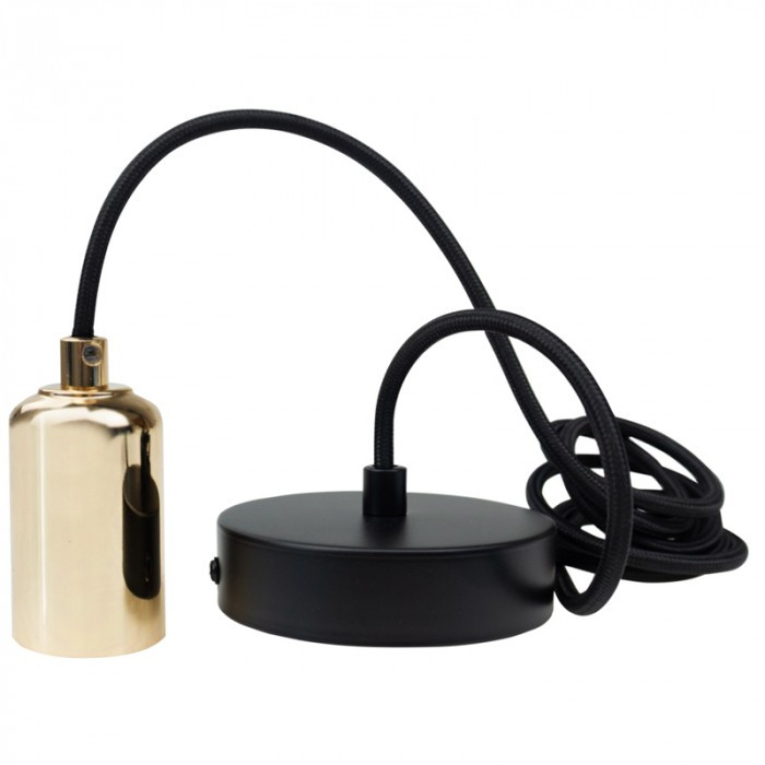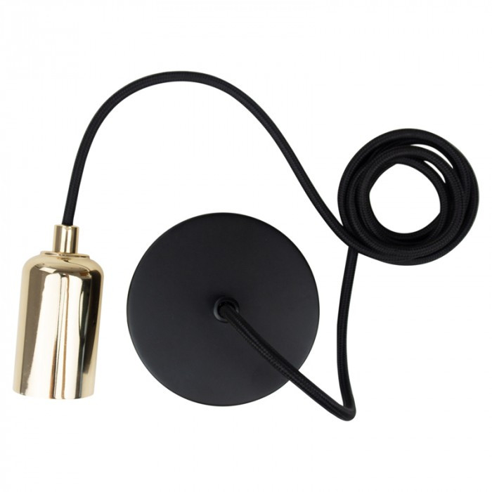 ZERO függesztett lámpafoglalat fényes arany színben, 2 méter hosszú fekete textil kábellel, E27 izzóhoz